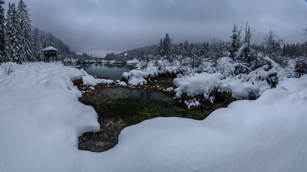 Nos esperan escenas alpinas, lagos enormes y otros más íntimos y escondidos. También nos acercaremos a un par de cascadas realmente espectaculares. Buscaremos estampas invernales con cabañas y árboles como protagonistas. Estaremos atentos a lo que nos ofrezca este entorno tan mágico y delicado en invierno.